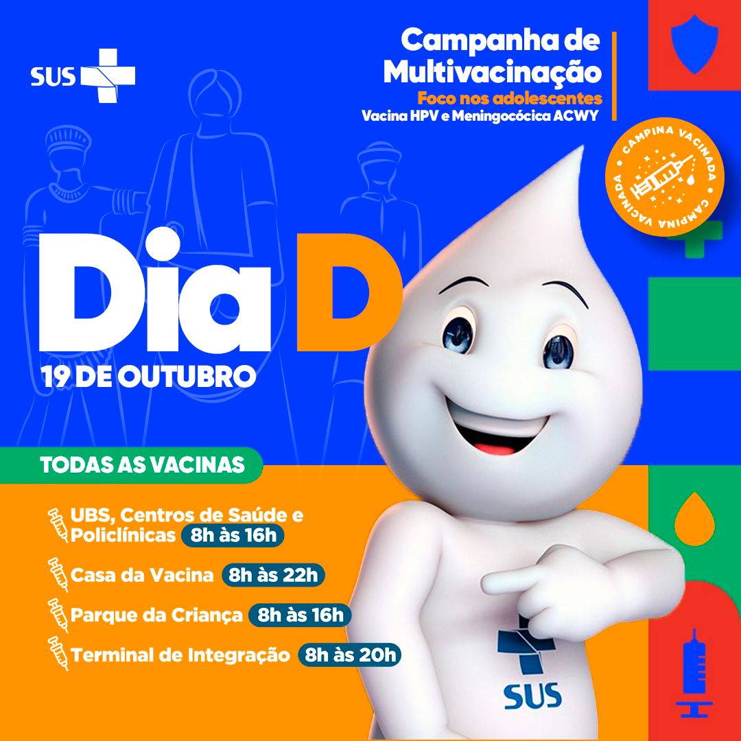 No mês de outubro, comemora-se o Dia Mundial de Combate às Meningites. Outubro é também o mês alusivo ao combate ao câncer de colo de útero. Um dos objetivos do Dia D de Multivacinação é apoiar essas campanhas de conscientização. No entanto, a ação irá oferecer todas as vacinas do Calendário Nacional de Imunização para todas as faixas etárias, desde crianças até idosos.