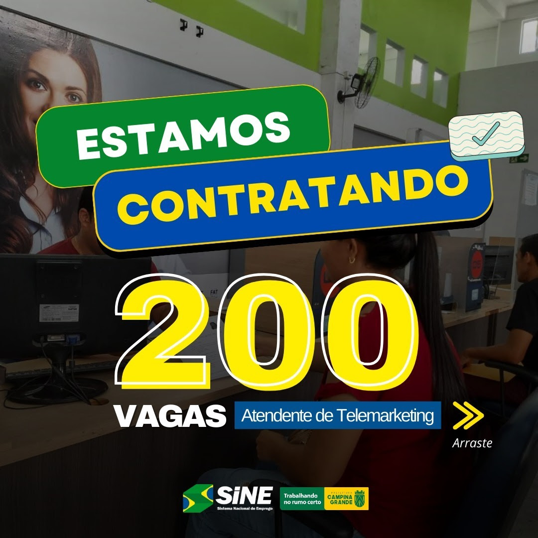A Prefeitura de Campina Grande, por meio do Sine Municipal, está ofertando 200 novas vagas para Atendente de Telemarketing com contratação imediata.